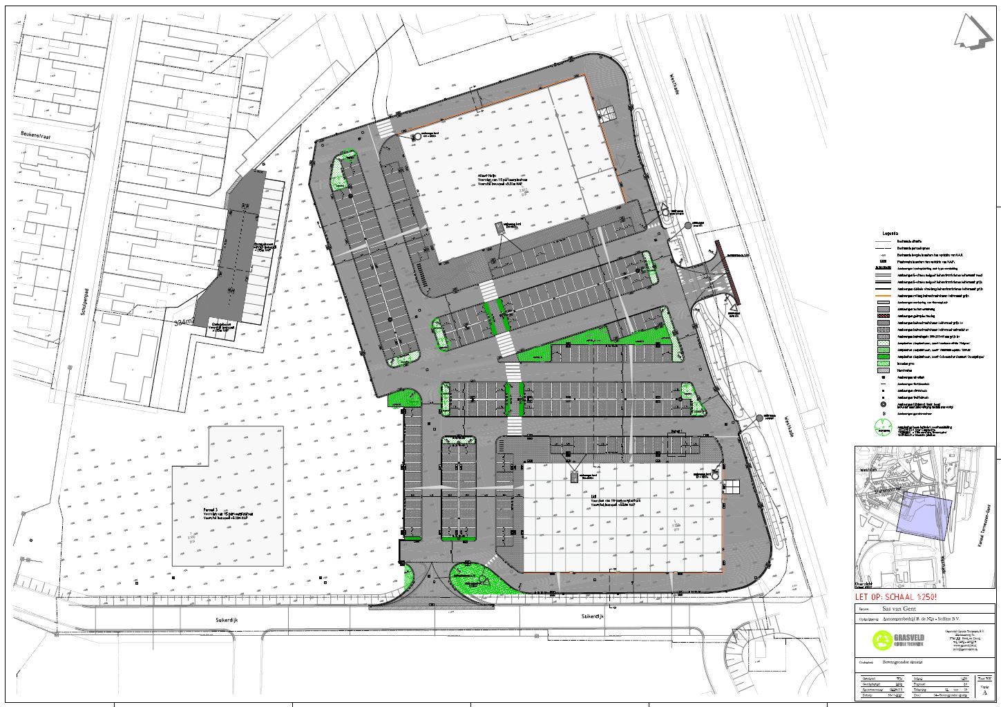Op onderstaande afbeelding staat de toekomstige inrichting van het terrein bij de supermarkten en de aansluiting op de Westkade en Suikerdijk. De inrichting van het terrein en de aansluitingen op de omliggende wegen zijn naar verwachting juli 2023 gereed. Op de tekening staat ook de toekomstige situering van een aantal garageboxen achter het Schulpenpad. De bouw van de garageboxen vindt plaats in mei en juni 2023.